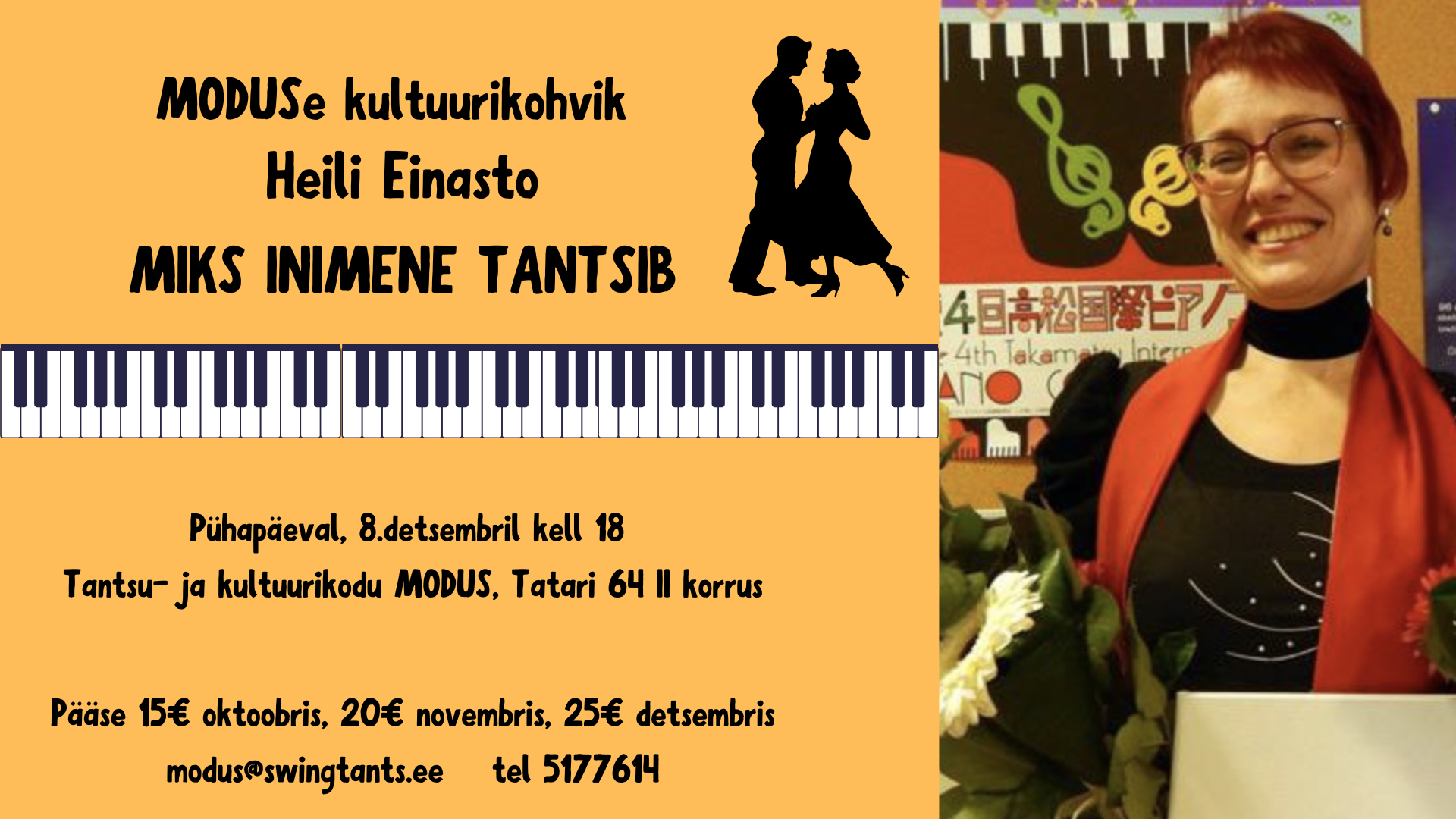 Külla tuleb Heili Einasto, et viia läbi arutlev loeng-diskussioon teemal “Miks inimene tantsib?” Tõepoolest, miks siis ikkagi? Antud kultuurikohvikus võib osaleda nii vaikse kuulajana kui innuka kaasa rääkijana. Loengut illustreerivad videonäited. Samuti soolod, duod ja triod MODUSe tantsijatelt.