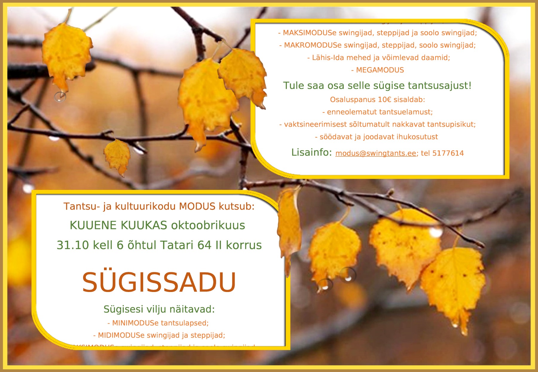Broneerimine: modus@swingtants.ee või tel 5177614. Maksete laekumine: EE362200221010259578, Tantsutrupp MODUS MTÜ. Maksed palun teha üksnes pärast broneeringu kinnituse saamist!