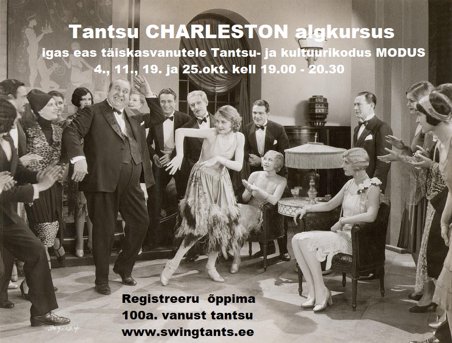 Oktoobrikuisel algkursusel saab algteadmised tantsust CHARLESTON. Kursus kestab 4 esmaspäeva: 4., 11., 18., 25.10. Kursuse tasu 50€/ inimene. Soovitav on tulla koos partneriga.