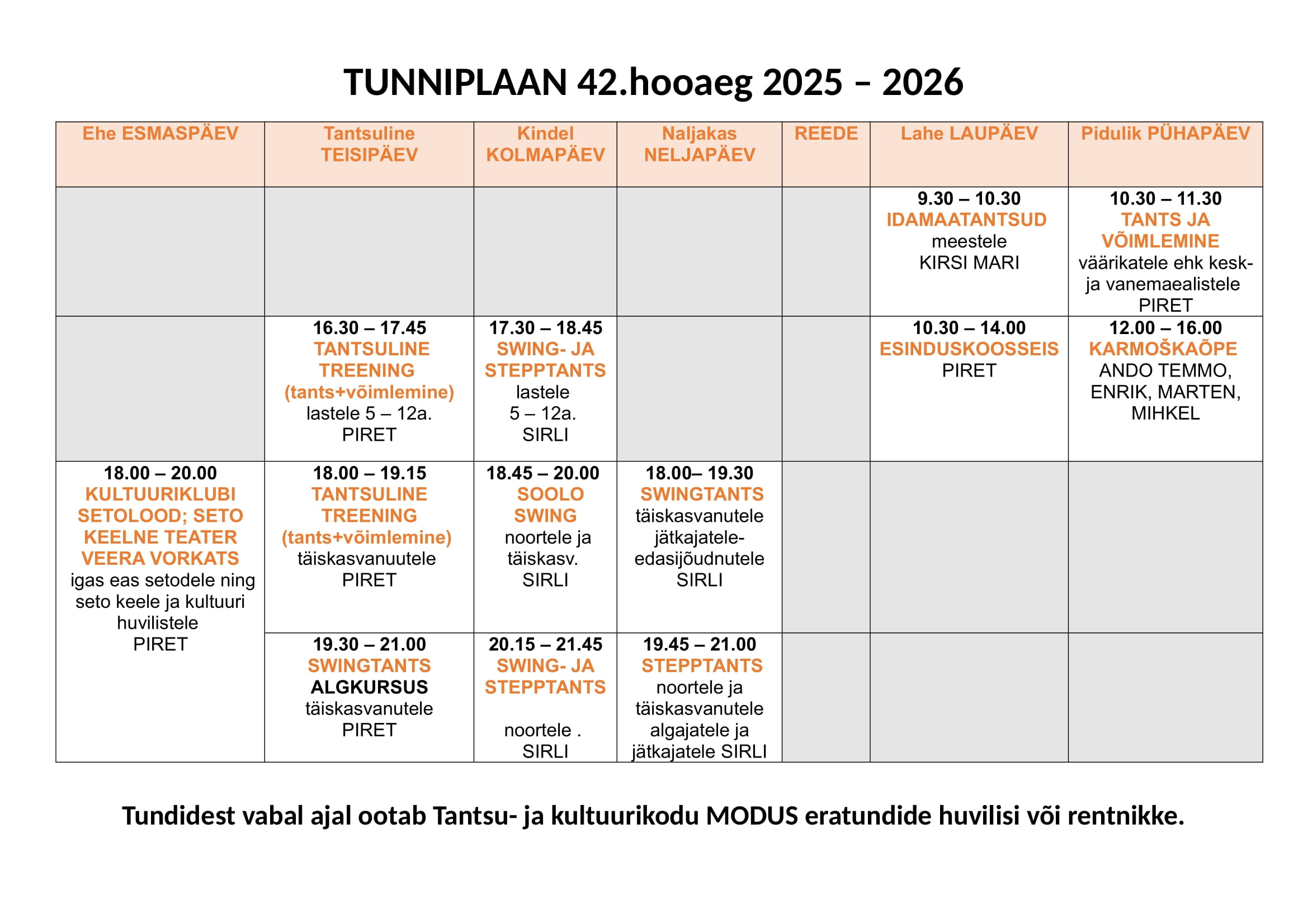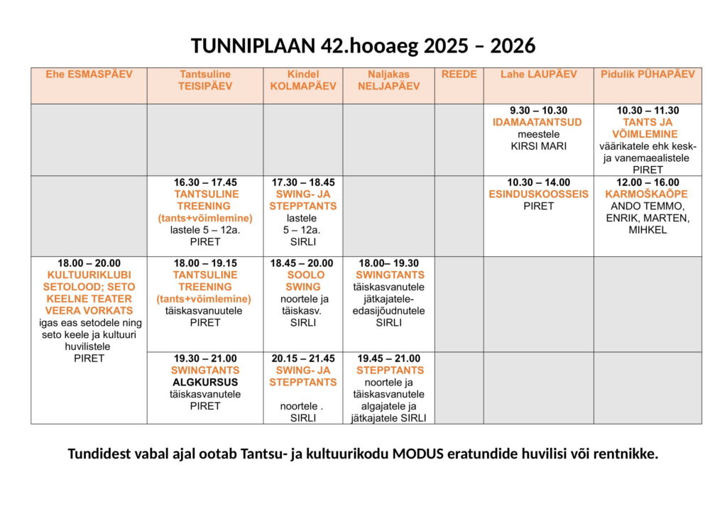 MODUSe 42.hooaja (2025-2026) tunniplaan. Liituda on võimalik aastaringselt. Tee oma valik ja registreeru!